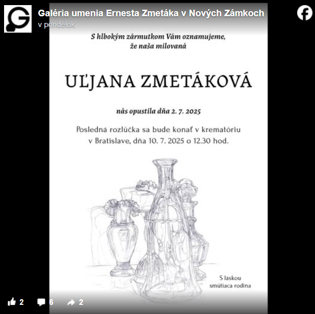 „S hlbokým zármutkom prijala slovenská výtvarná verejnosť správu o úmrtí významnej maliarky, predstaviteľky fotorealistickej maľby Uľjany Zmetákovej,“ zaznelo v oficiálnom oznámení.