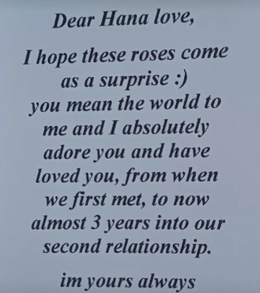 „Drahá Hana, láska. Dúfam, že tieto ruže dostaneš ako prekvapenie. Si pre mňa všetkým, zbožňujem ťa a ľúbim ťa od nášho prvého stretnutia doteraz – skoro tri roky, čo sme druhýkrát spolu. Som navždy tvoj.“